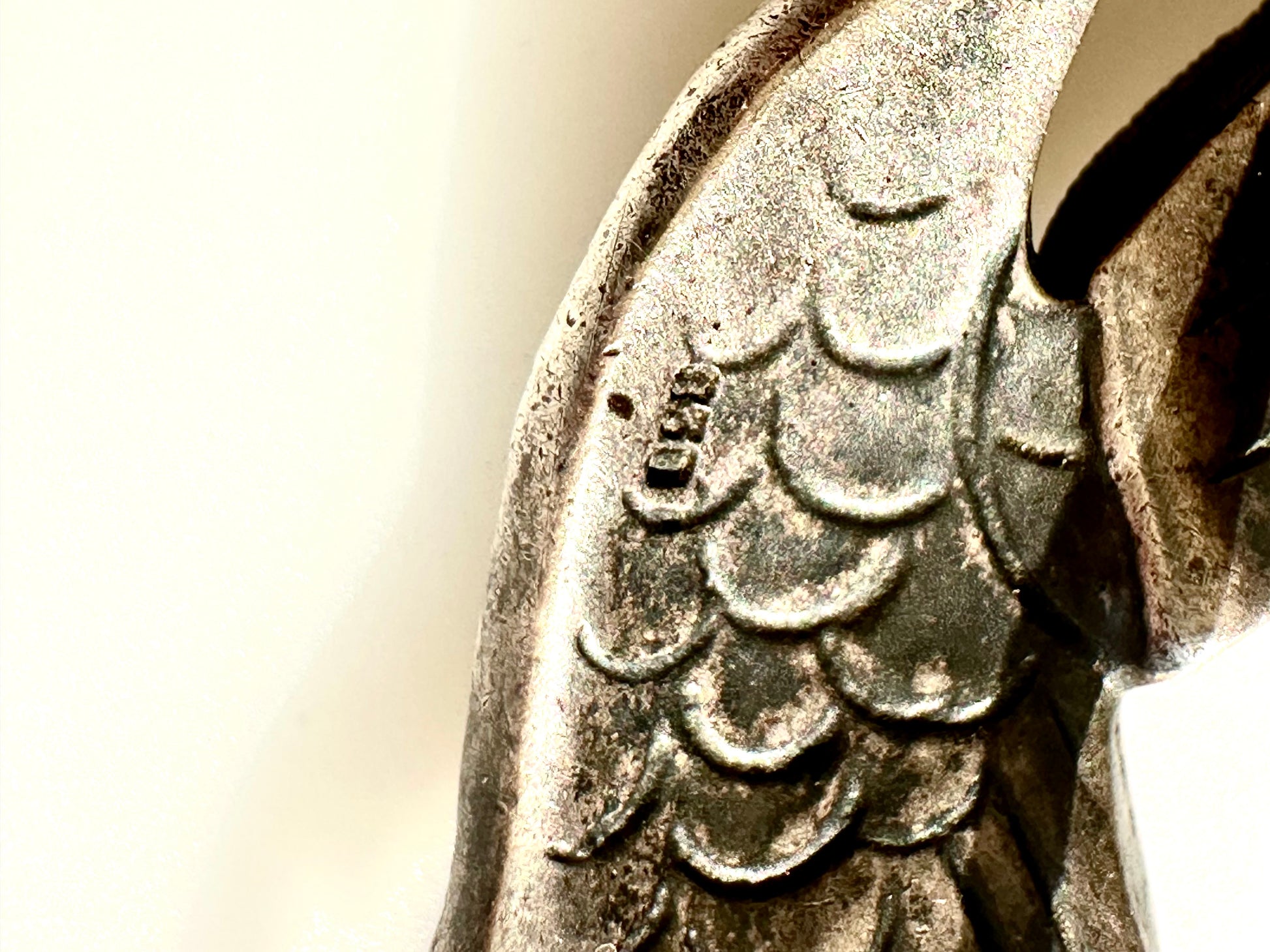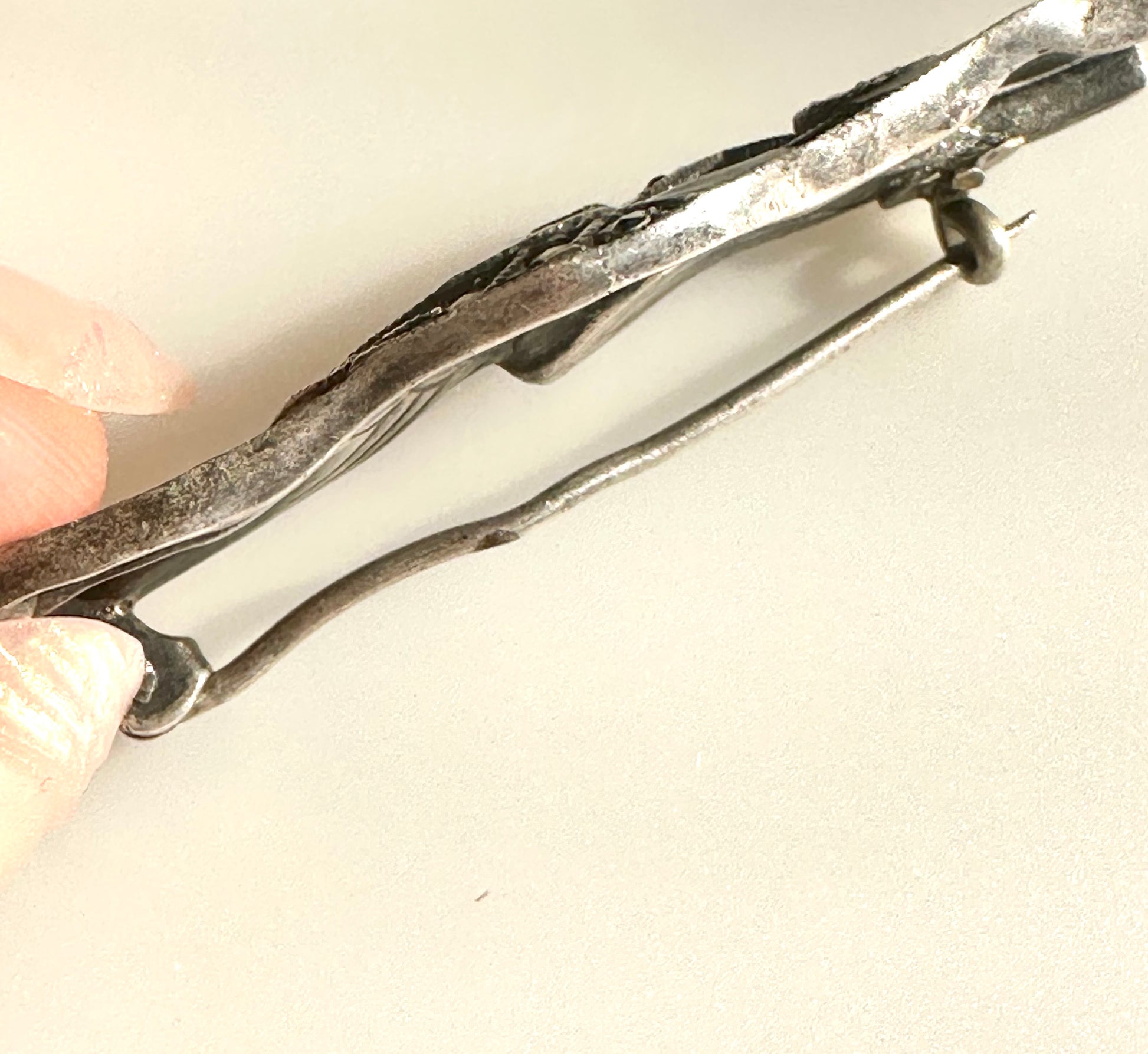 Beautiful, well-crafted antique pin.. a heron or other bird bird in flight. Marcasite and enamel on 830 silver… even the back of the pin is beautifully crafted. The enamel looks like it needs attention in a couple spots… see the closeup. Just under 2” long. |