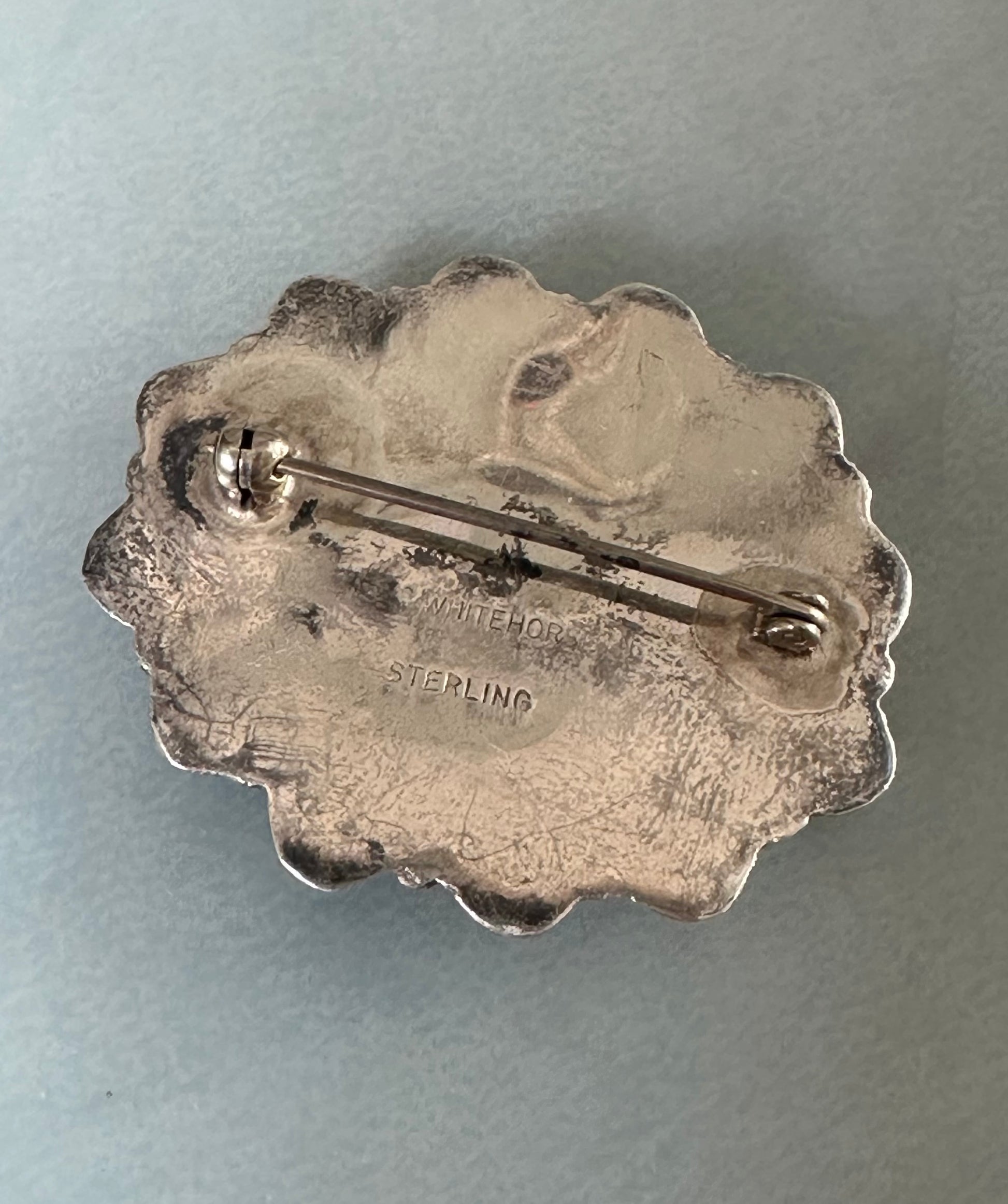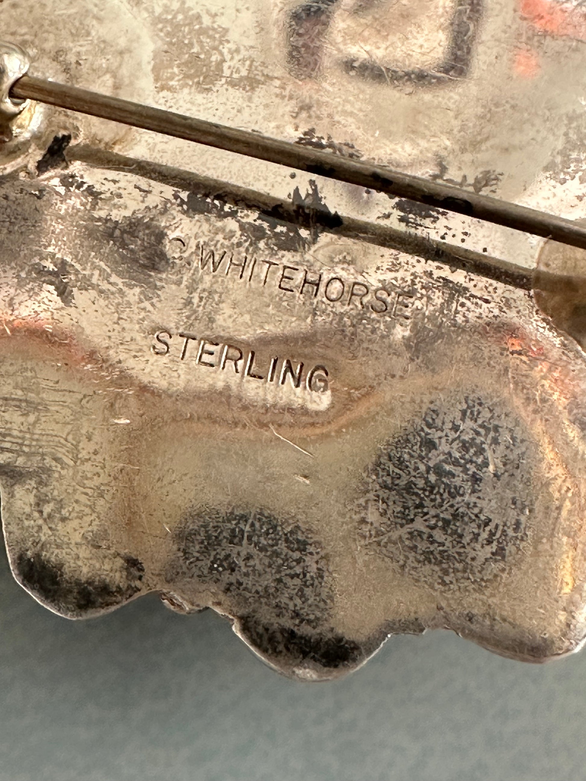 This is a beautiful vintage Navajo made brooch signed by C Whitehorse. The stone is perfect… it is a well crafted piece. There is a patina on it that can be cleaned off and shined up. |