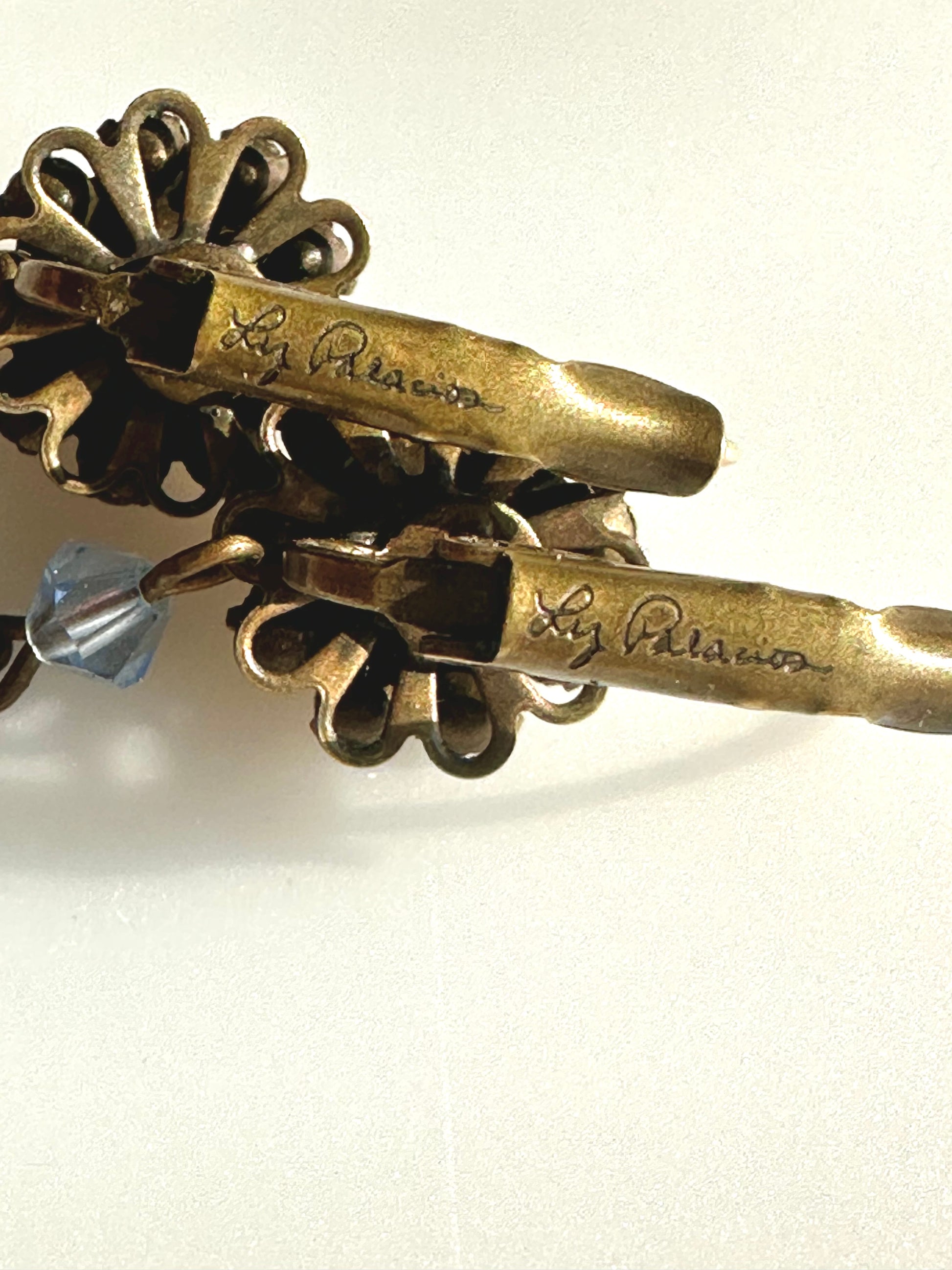 Liz Palacios blue rhinestone floral dangle earrings… they dangle just under 1.5”. As always, nicely made and signed on the back.