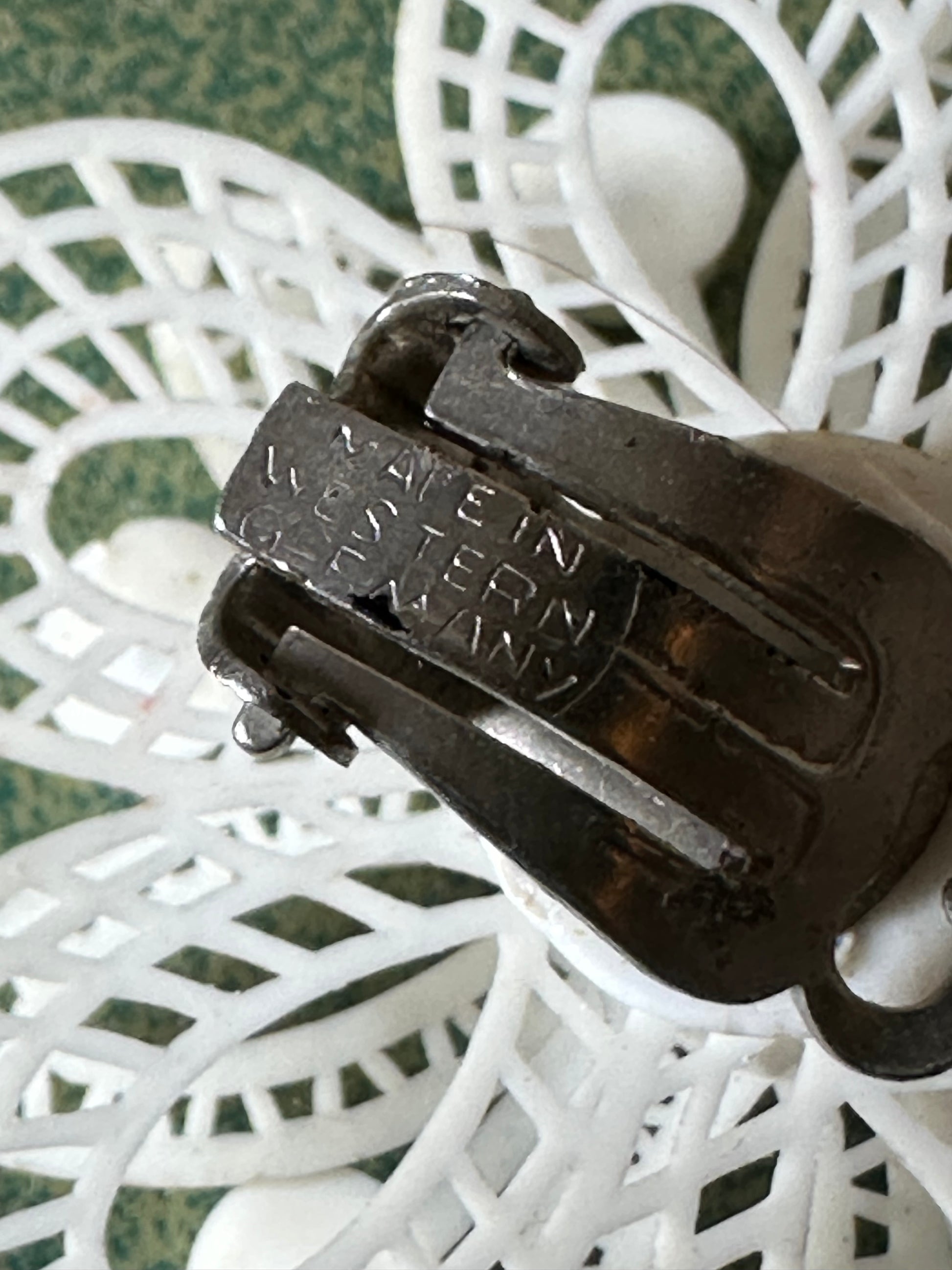 Signed Western Germany Black And White Plastics Lace Flower Earrings