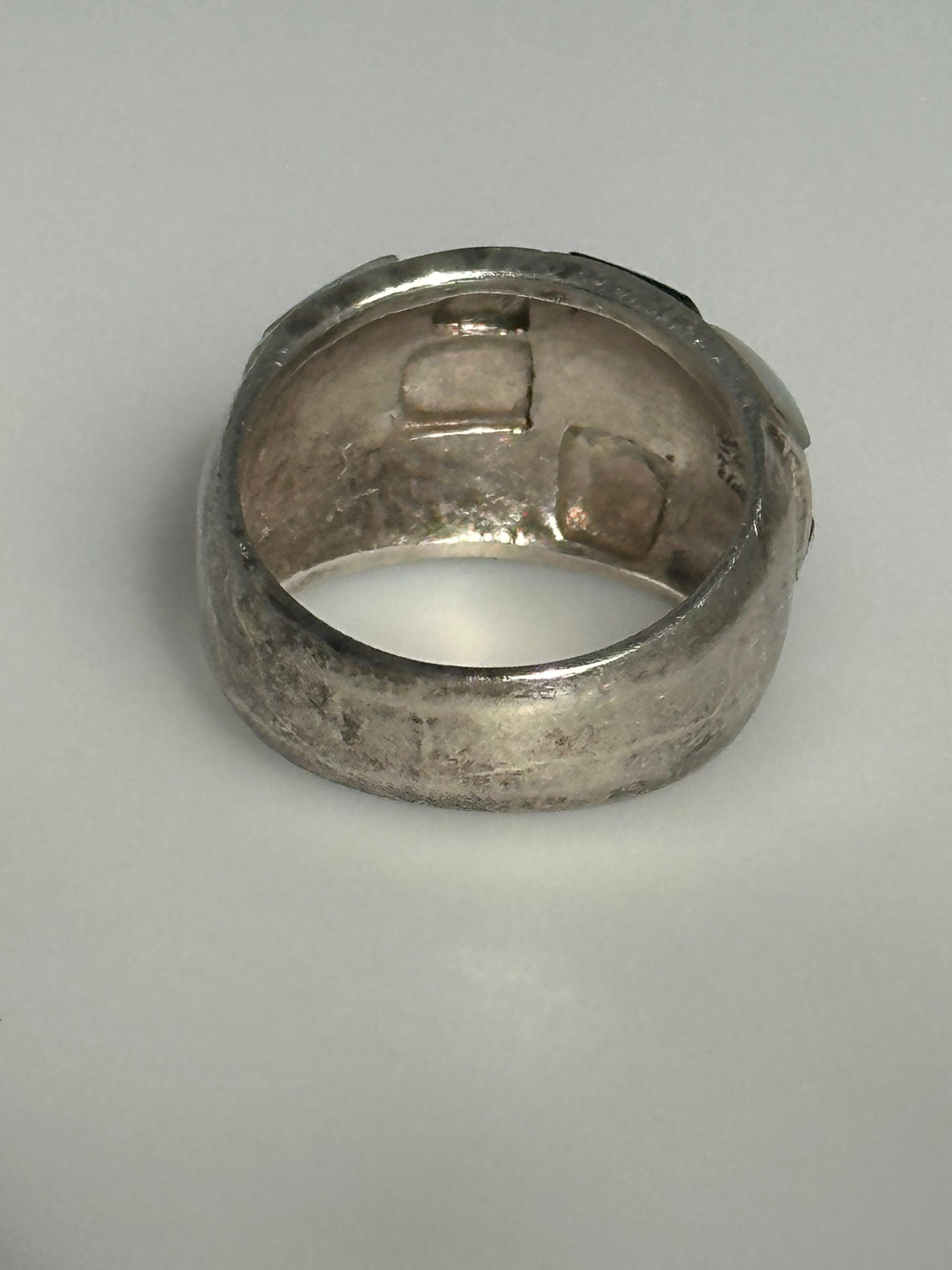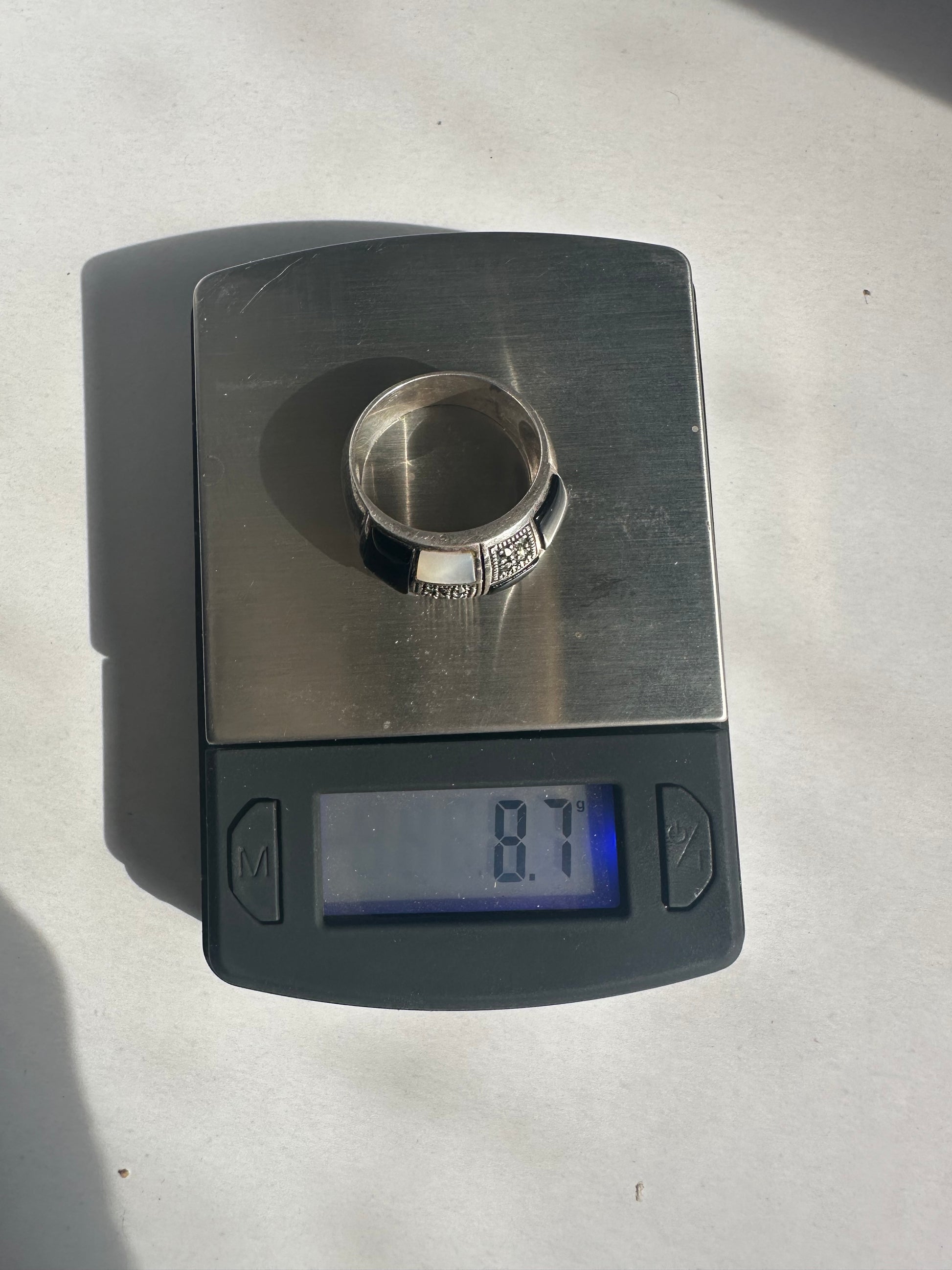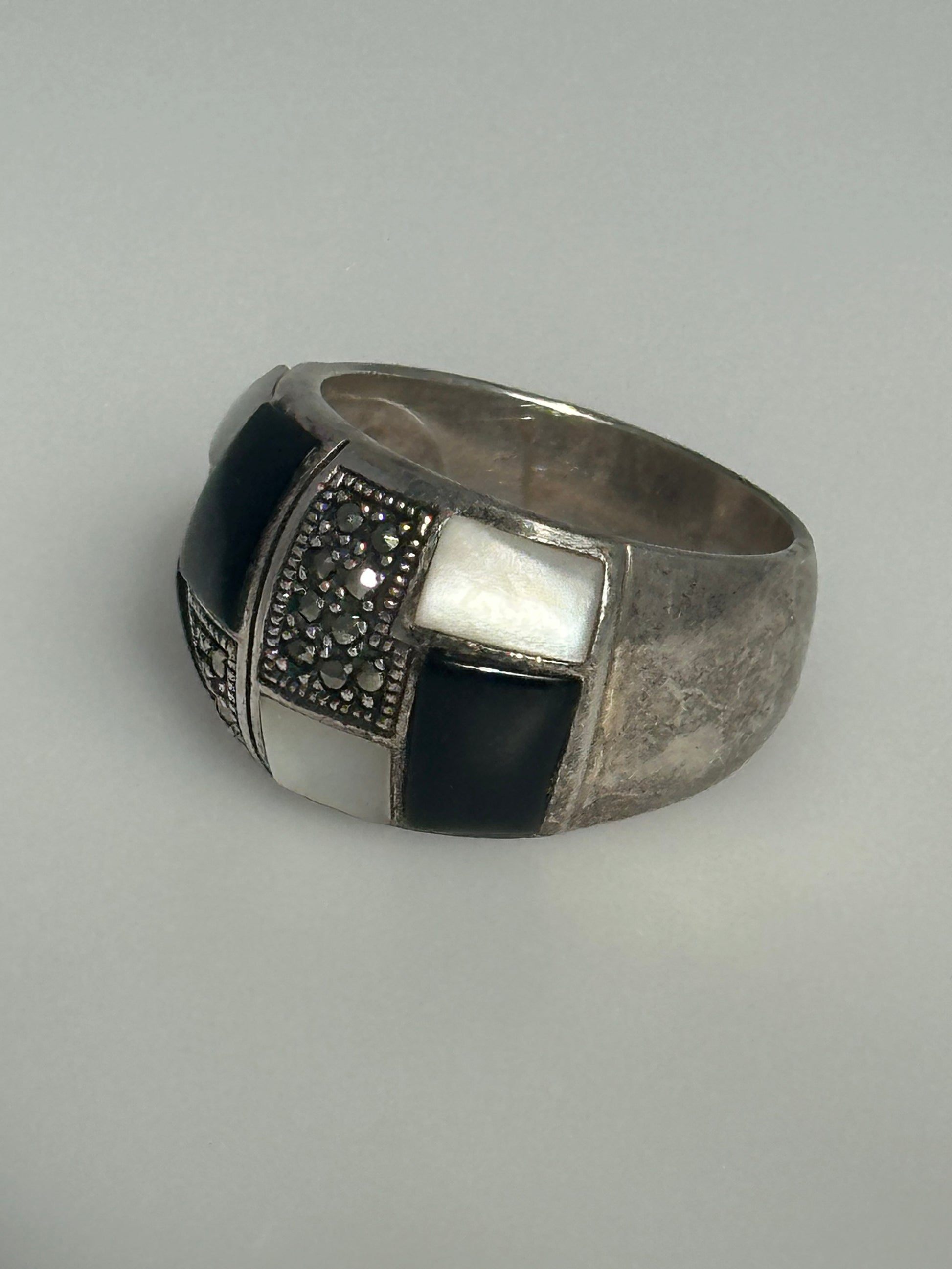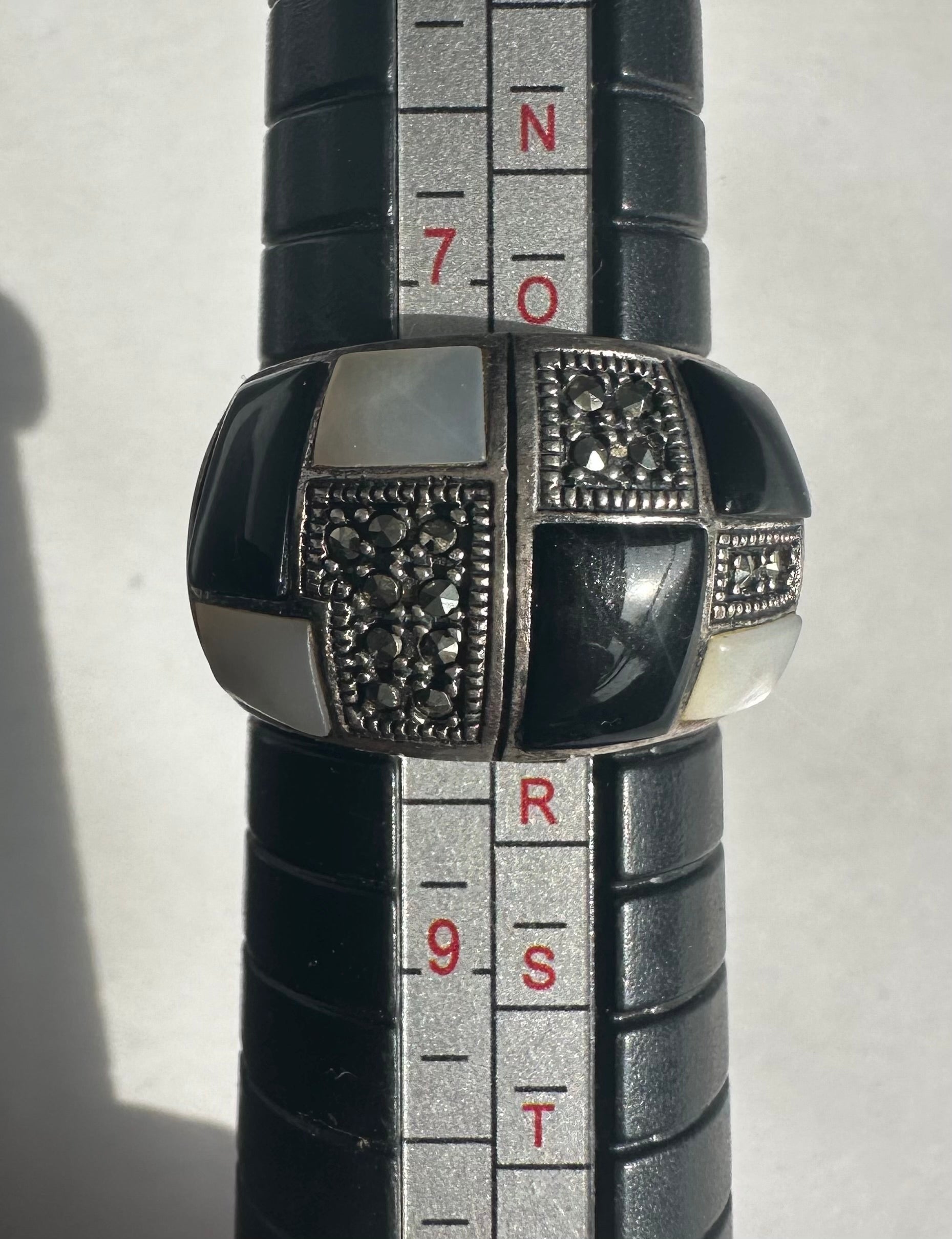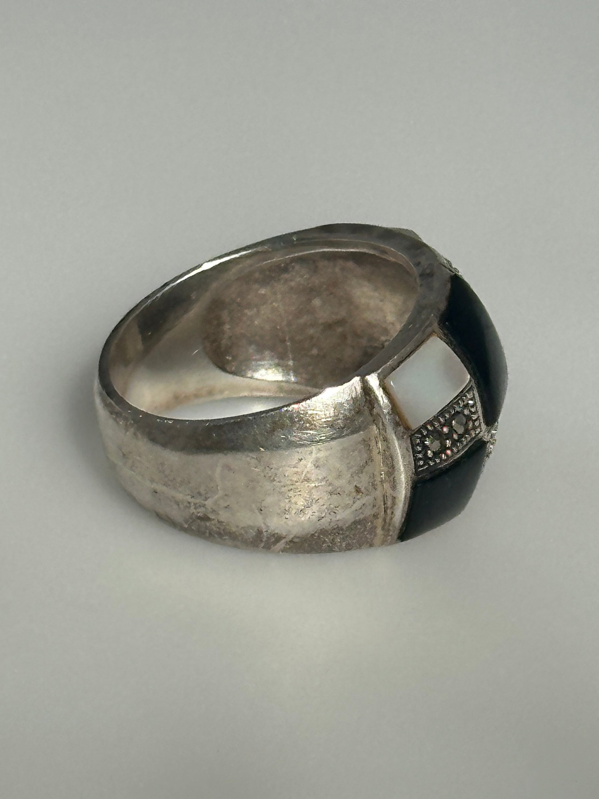 Sterling Silver Pearl Black Onyx Inlay Rhinestone Statement Ring Size 8