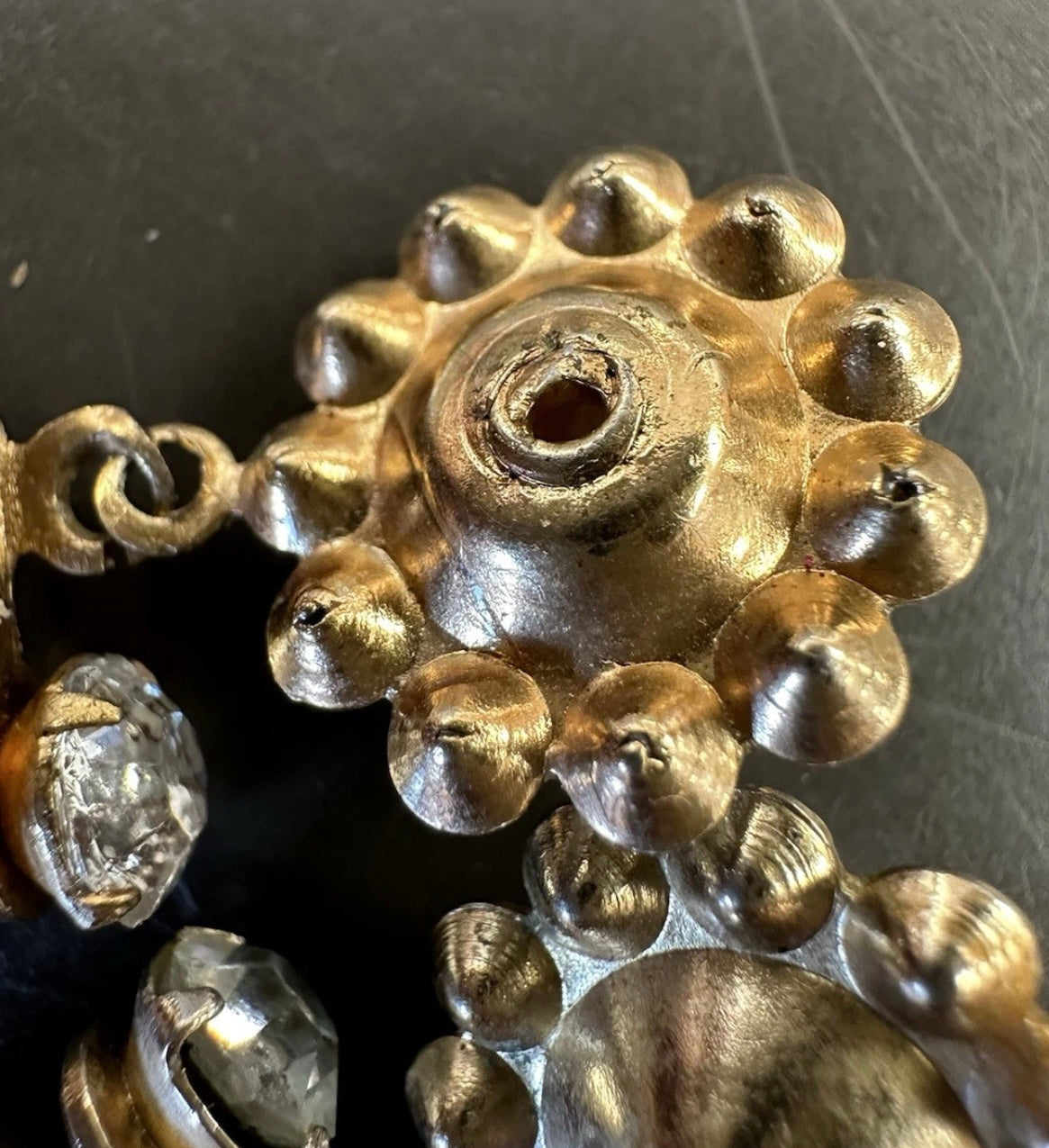 1920’s screw back earrings featuring floral ‘foil opals’ and rhinestones.