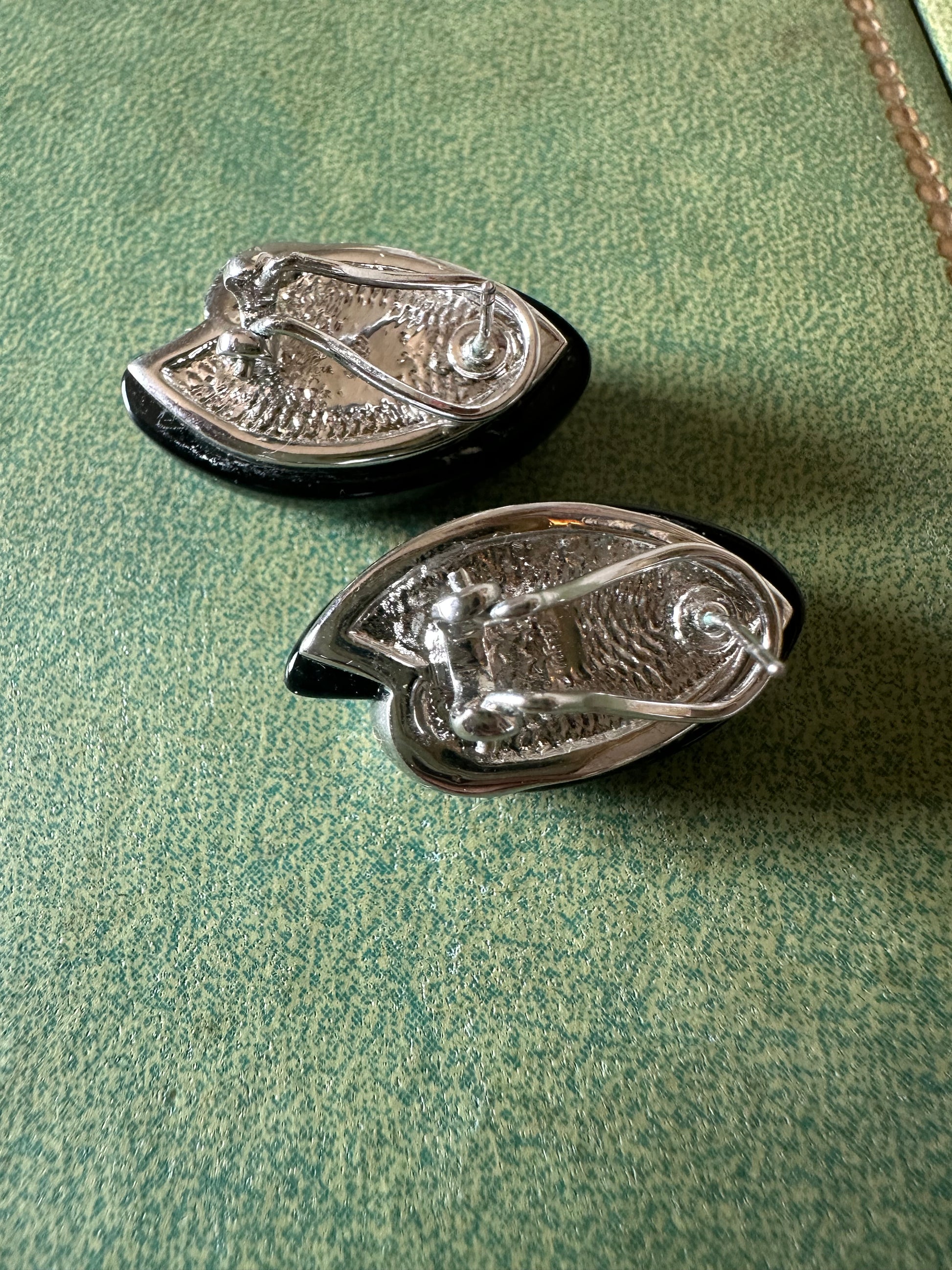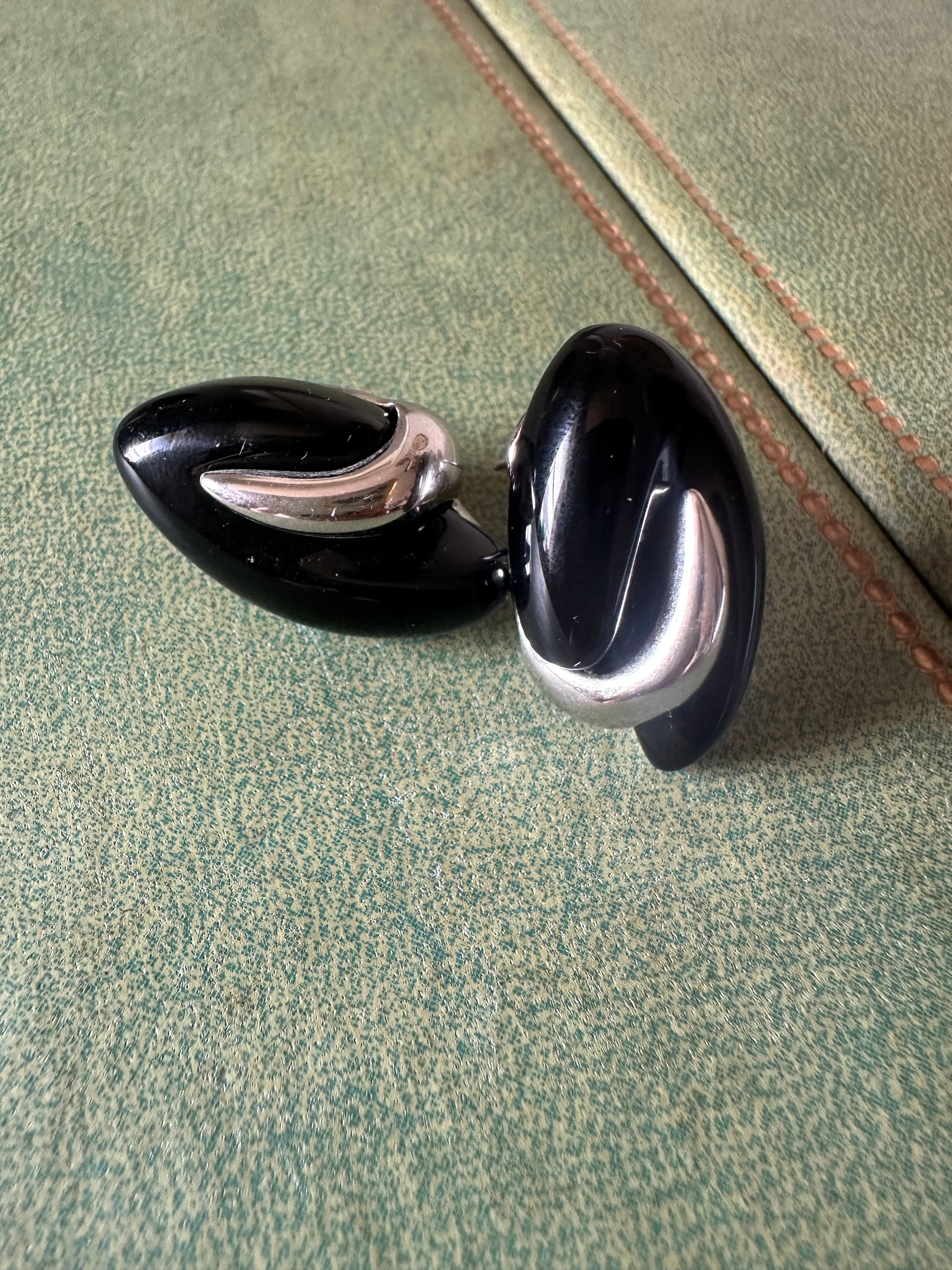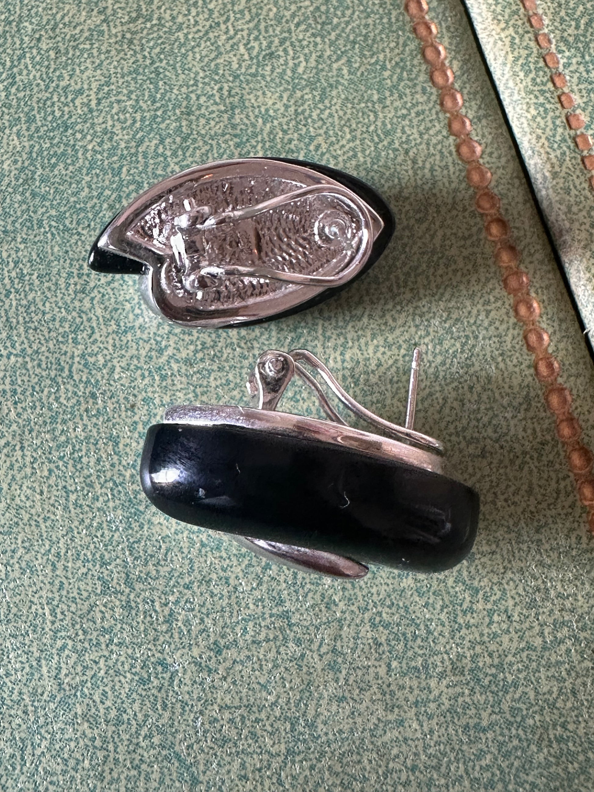 Vintage Earrings Signed Alljoy Sculptured Modernist Black Onyx Silver Omega Back