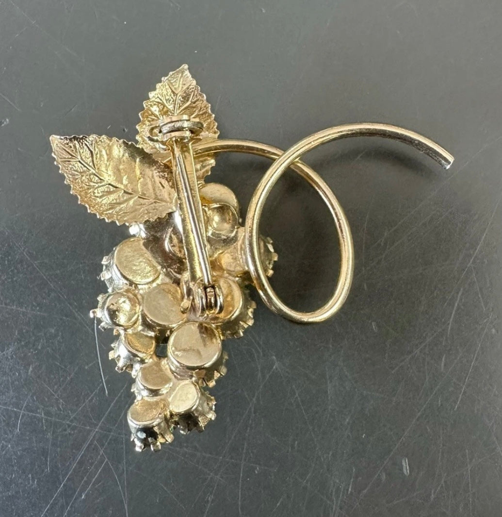 This vintage MCM grape cluster brooch features a stunning bright light green uranium glass, adding a touch of glamour to any outfit. Its early mid century design and excellent condition make it a must-have for any collector. Measuring at 1.5" x 1.5", it is a perfect statement piece.