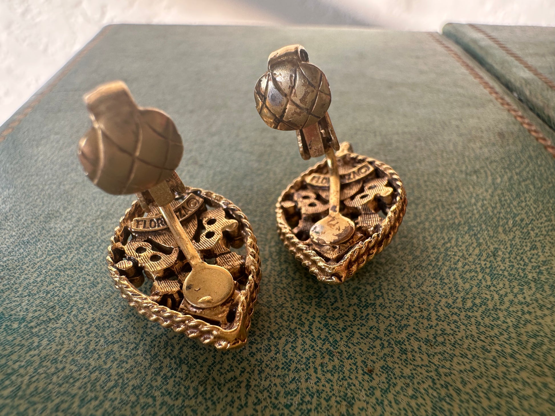 A beautiful pair of vintage Florenza Victorian revival style clip on earrings with faux pearls. Good condition. See pictures for details and measurements.